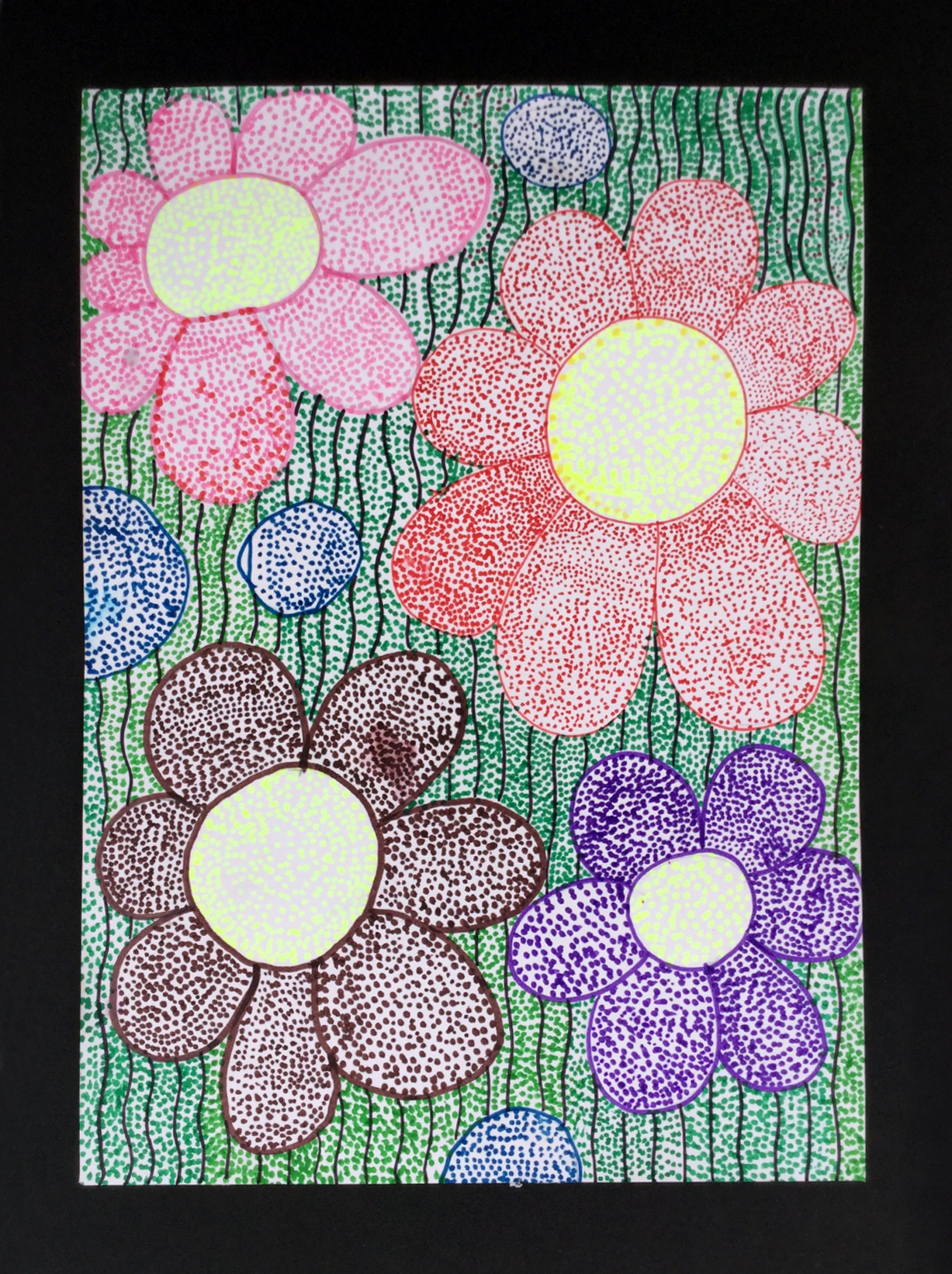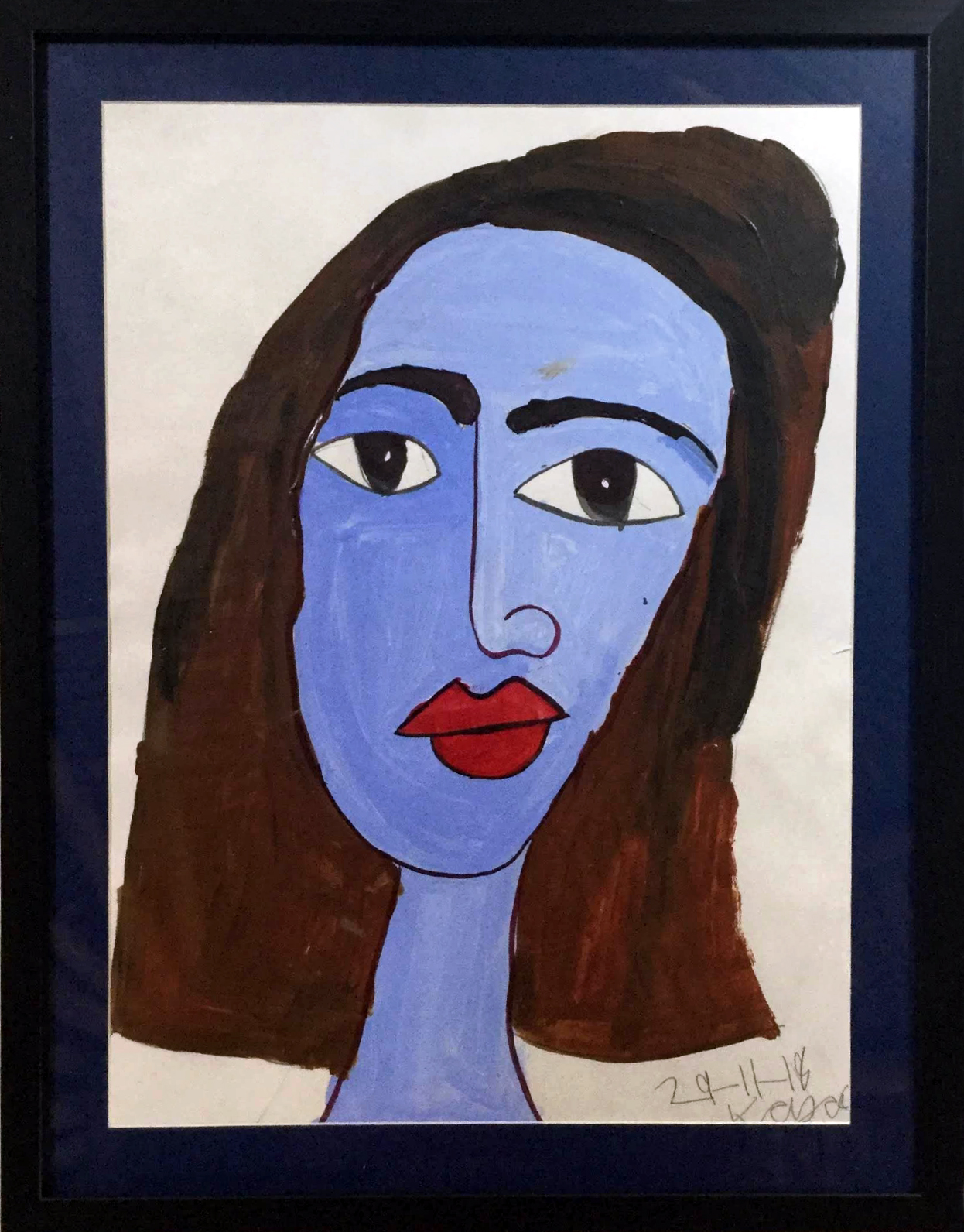 Kajal is a happy child who is mostly self sufficient. She has always been making art, but in recent times we have seen a dramatic change in her conceptualisation and art skills. These are her three most recent works. With the blue face painting she is starting to become more experimentative with her art and taking risks/making bold choices with the use of colour and imperfection in the face drawing.